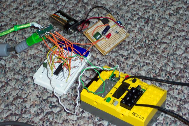 The basic idea was to use a Playstation 2 controller to drive a (dirt simple) robot made using the Lego Mindstorms kit. To connect the PS2 controller to the Lego Mindstorms control unit (RCX) I used a PIC microcontroller.